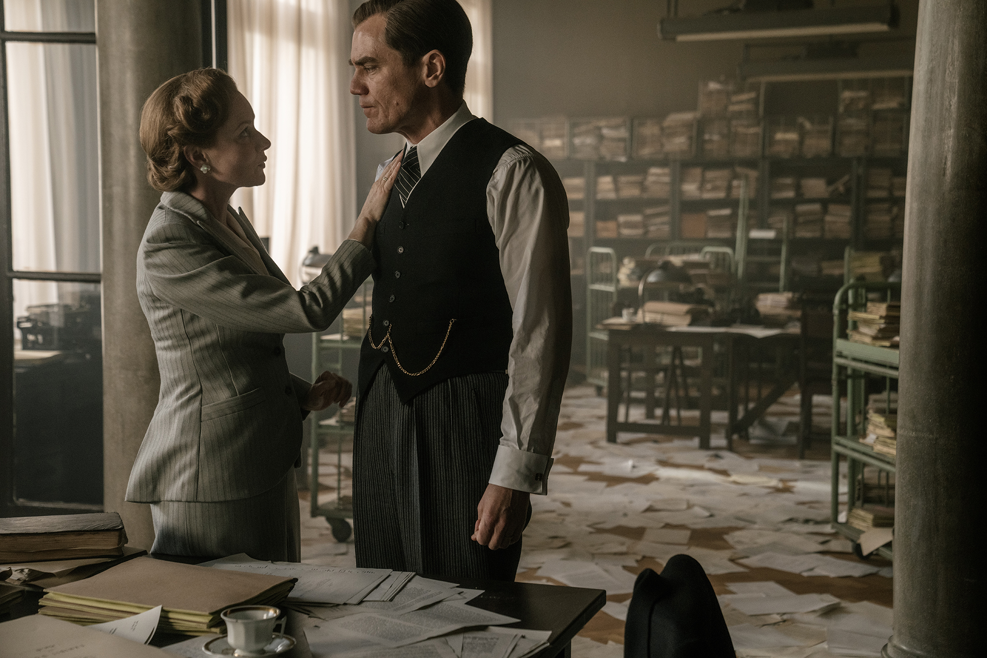 James Vanderbilt brings a Hollywoodesque Nuremberg to the screen, with grandiose sets and color correction used to desaturate the tones. The plot eludes faithful reconstruction: in fact, the actual focus is on recounting the relentless duel between the arrogance of a criminal and History’s judgement. The decline of the hierarchs is embodied by Russell Crowe who, with his majestic physique, portrays Göring as a vain and arrogant man, who is unable to face defeat and the horrors of the Reich. Douglas Kelley, who challenges his arrogance, is properly played by Malek; however, his characterization strongly relies on hagiographic tones. The supporting cast has not been given enough relevance: Michael Shannon’s excellent performance is not given adequate space, nor is the rest of the German high command, which is relegated to the background.